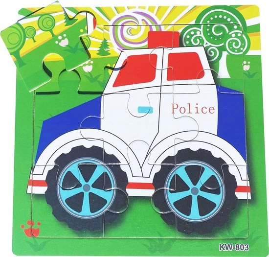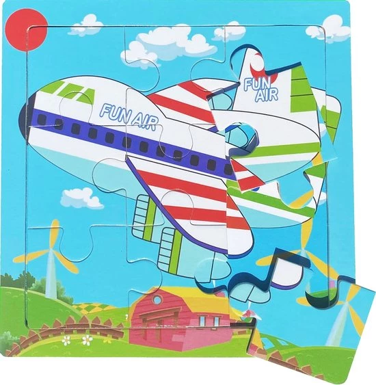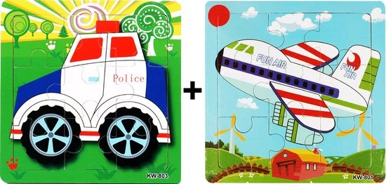 Set van 2 houten legpuzzels van een vliegtuig en een politie auto. Alle twee de puzzels bestaan uit 9 stukjes.