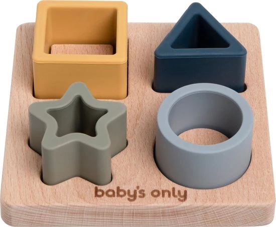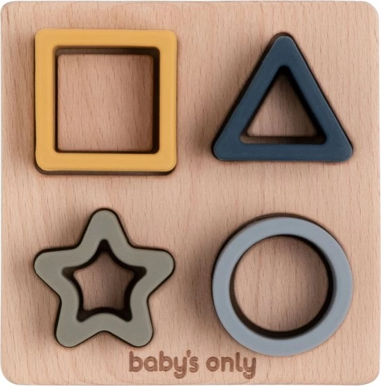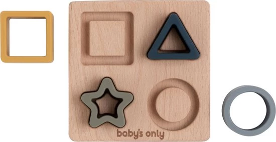 Het setje bestaat uit vier figuren (rondje, ster, vierkant en triangel) en een houten onderkantje. Geschikt vanaf 6 maanden.