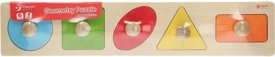 - – De kit bevat: een bord met holtes en 6 elementen die geometrische figuren vertegenwoordigen met pinnen om vast te pakken