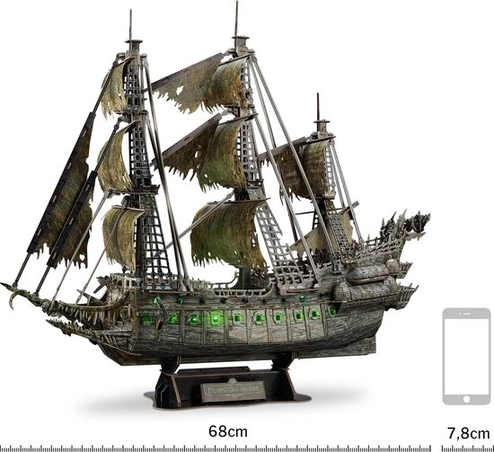 Dit prachtige Flying Dutchman-model heeft twee dekken en een rij meedogenloze kanonnen aan elke kant van het schip. Het unieke boegsprietontwerp bestaat uit skeletbeelden en bewerkte gedetailleerde ornamenten. De romp is gemaakt van verrot hout met groene LEDs. De scheepsboog in monstervorm en het mysterieuze ?Poop Deck? met standbeelden zullen je 3D-puzzel van het piratenschip tot leven brengen.