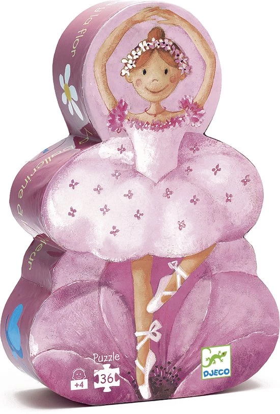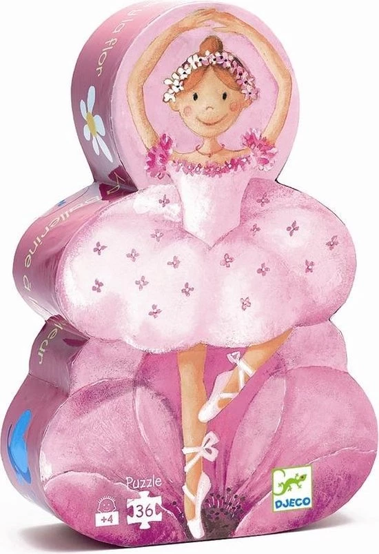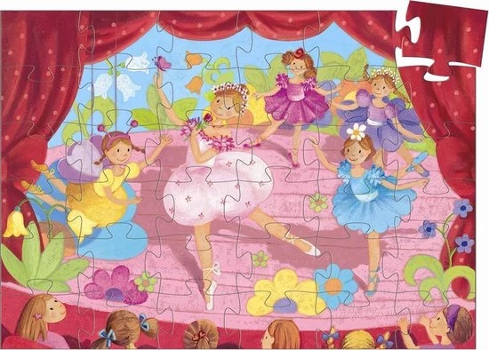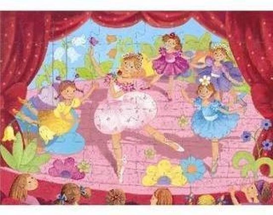 Een vrolijk gekleurde puzzel van het Franse merk Djeco. Op de puzzel staan verschillende danseressen op een podium met allerlei bloemen om zich heen.