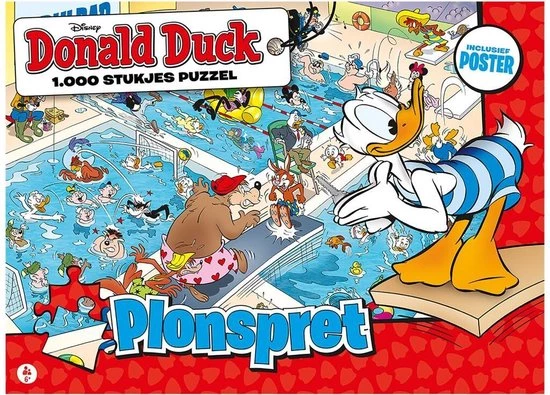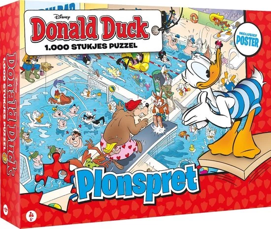 PLONSPRET Donald Duck is het vrolijkste weekblad van Nederland! Beleef de spannende en grappige avonturen van Donald en zijn neefjes, Katrien, oom Dagobert, de Zware Jongens en andere inwoners uit Duckstad. De puzzel is opgebouwd uit 1.000 stukjes en is geschikt voor puzzelaars van 6 tot 106! In Duckstad kan zelfs een zwemwedstrijd in het water vallen. Maar met een beetje denksport kun jij deze plonsplaat weer compleet maken. Ben je klaar met alle stukjes? Dan mag je jezelf puzzelkampioen noemen!