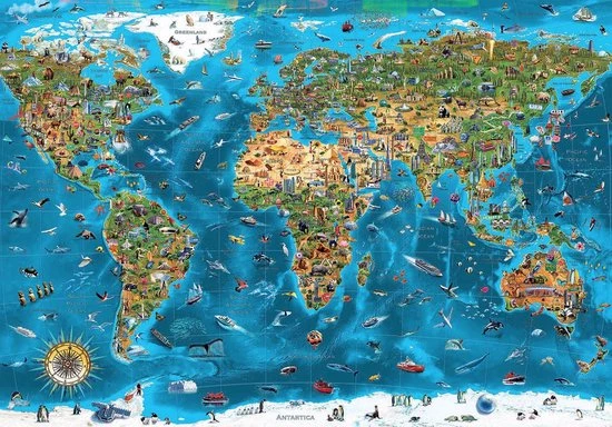 De wereldkaart met de mooiste dieren en de spectaculairste gebouwen.