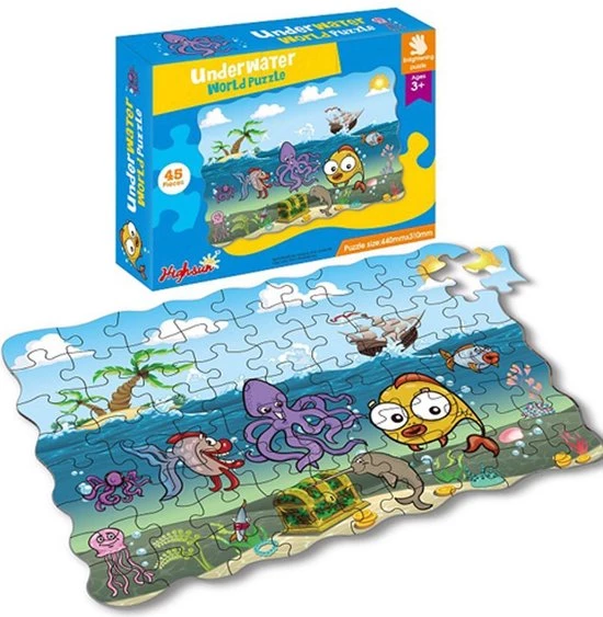 De leerzame puzzel met een oceaan, onbewoond eiland, boot en unieke visjes bestaat uit 45 stukjes. De puzzelstukjes zijn bedrukt met mooie felle kleuren. De afbeelding is warm, gezellig en leerzaam.