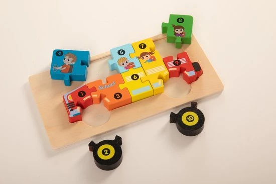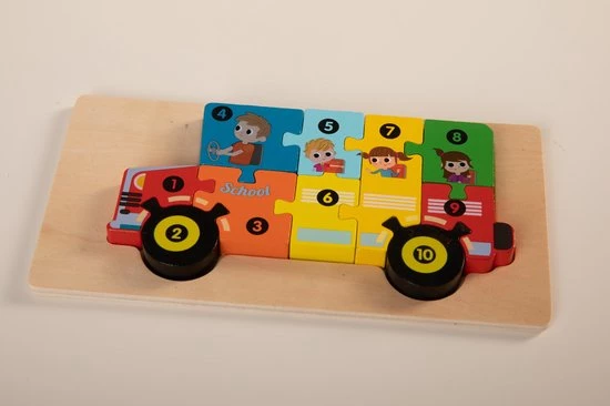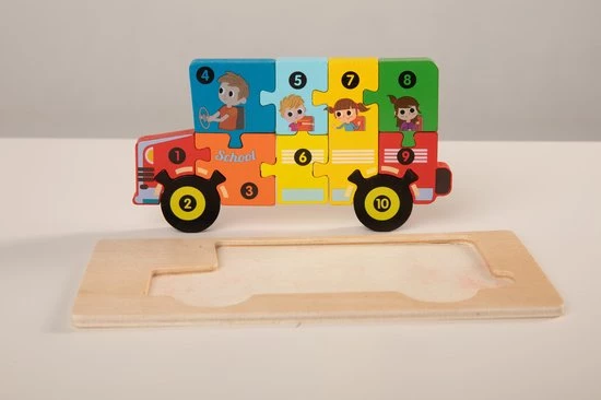 Een praktische leermethode voor rekenen ?n spelen. Een houtpuzzel in de vorm van een schoolbus in elkaar zetten en tegelijkertijd leren tellen van 1 tot 10, hoe leuk is dat?