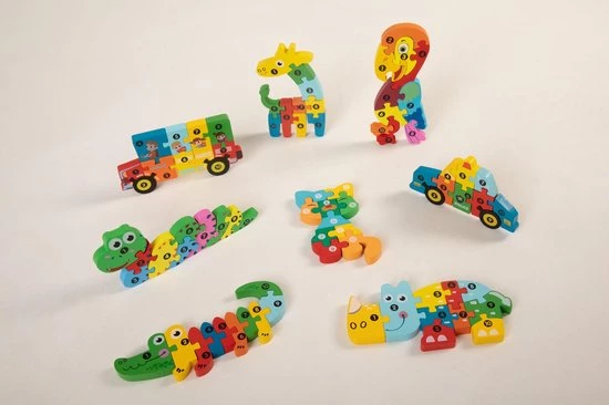 – 8 verschillende soorten (Dino, Schoolbus, Neushoorn, giraffe, Slang, Politieauto, Papegaai, Vos, Krokodil)