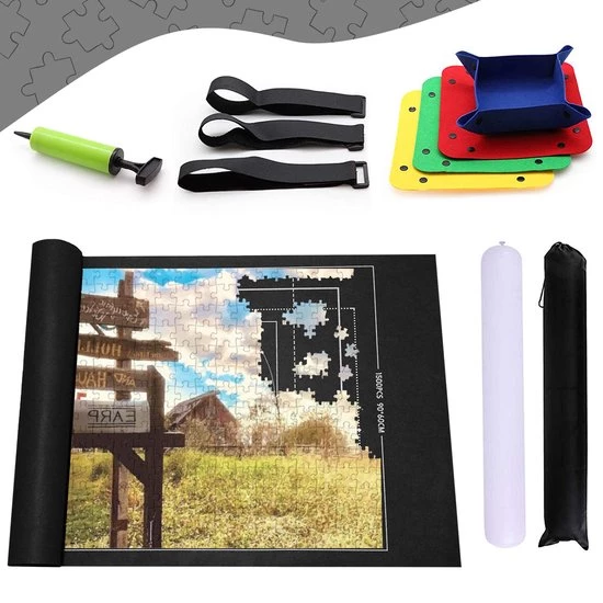 – Om je puzzel weer op te bergen pomp je de tube op, rol je de mat hier voorzichtig omheen, maak je de opgerolde puzzelmat vast met de riemen en berg je het op in het opbergzakje