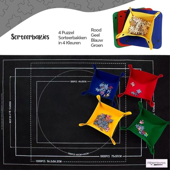 Met deze puzzelmat van HobbyMania berg je je puzzel in een mum van tijd op en kan je deze zo weer uitrollen om weer verder te gaan! De handige puzzel sorteerbakjes zorgen ervoor dat je de puzzelstukjes op een overzichtelijke manier kan sorteren.