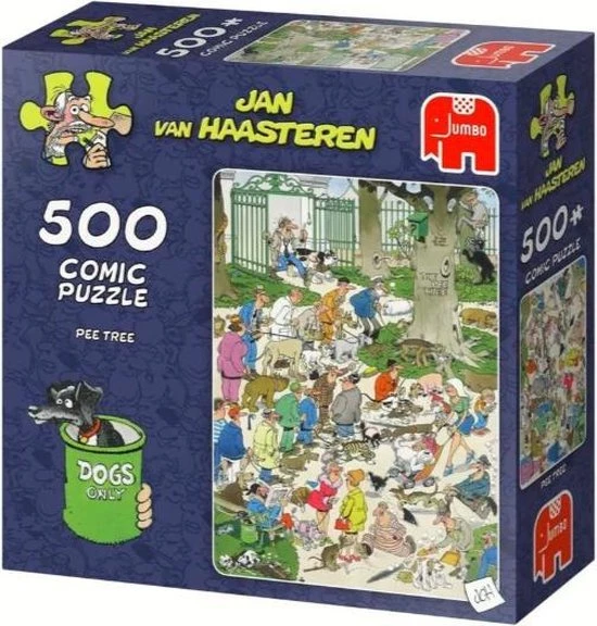 De grappige Jumbo Jan van Haasteren Pee Tree Puzzel laat zien hoe het eraan toe gaat bij een hondentoilet. De puzzel bestaat uit 500 stukjes.