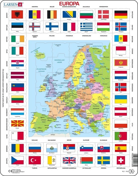 Met Larsen leer je de wereld kennen terwijl je aan het puzzelen bent. Leg de puzzel en zie Europa tevoorschijn komen. Zoek hierna het juiste puzzelstuk bij het bijbehorende land. De stukjes leg je op een puzzelplaat, waardoor je jouw creatie makkelijk verplaatst of inlijst.