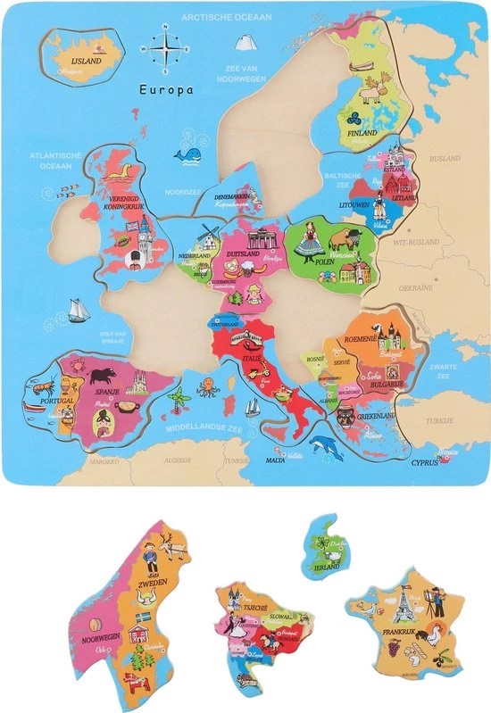 De puzzel ziet er fris en kleurrijk uit en is zeer aanlokkelijk om mee te spelen. De stukjes zijn de verschillende landen van Europa of verschillende landengroepen. De landen hebben verschillende aantrekkelijke kleurtjes en de verschillende trekpleisters van een land zijn in eenvoudige tekeningetjes uitgebeeld. Zo zie je een molen in Nederland, een zak patates-frites in Belgi?, de Eiffeltoren in Frankrijk, de Big Ben in Engeland en nog veel meer.