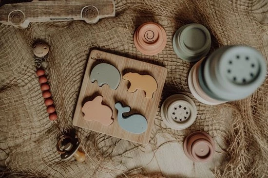 | Verpakkingsinhoud | 1, Houten, legpuzzel, met, 4, siliconen, elementen;, olifant, ijsbeer, konijn, en, walvis |