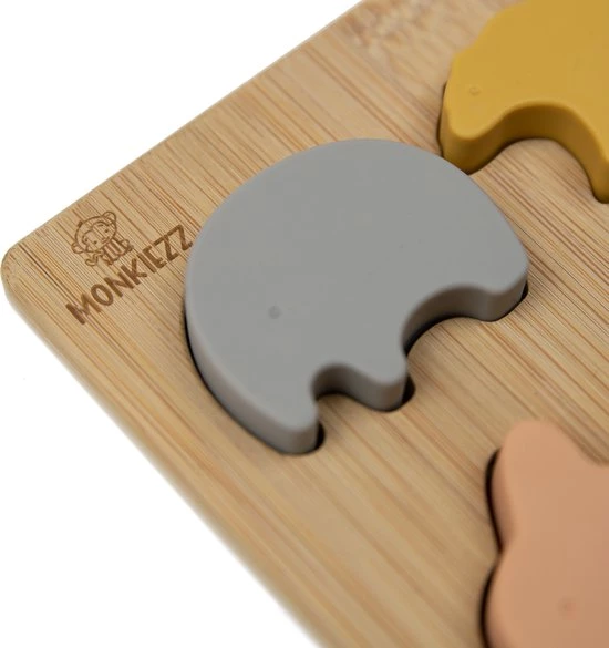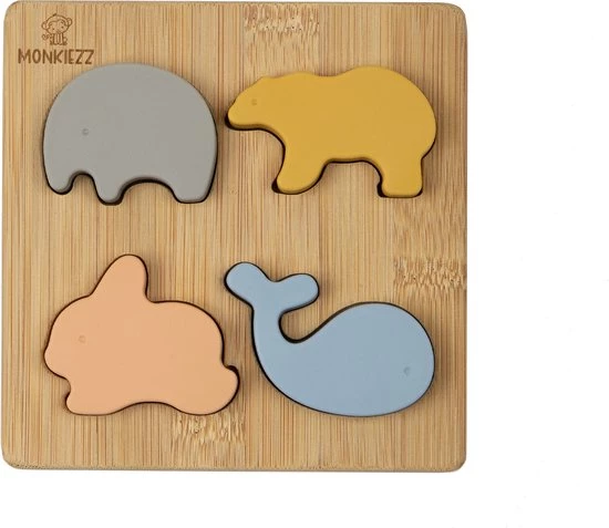 Monkiezz Houten Puzzel – Animal | Educatief | Spellen | Speelgoed | Silicone | Olifant, Ijsbeer, Konijn En Walvis | Vormenpuzzel
