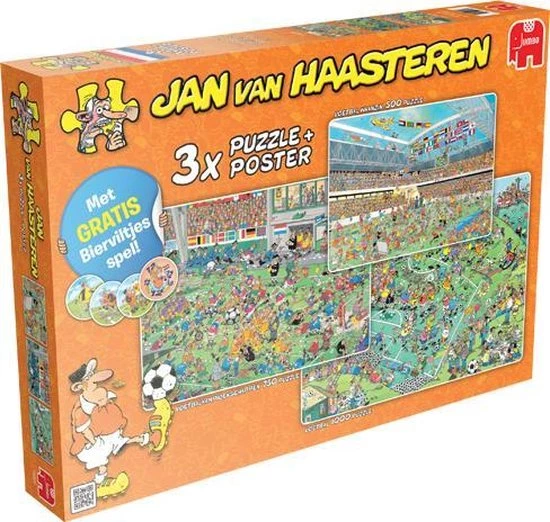 Puzzel Jan Van Haasteren 3 In 1 WK Voetbal +Spel. Puzzels zijn 500, 750 en 1000 stukjes.