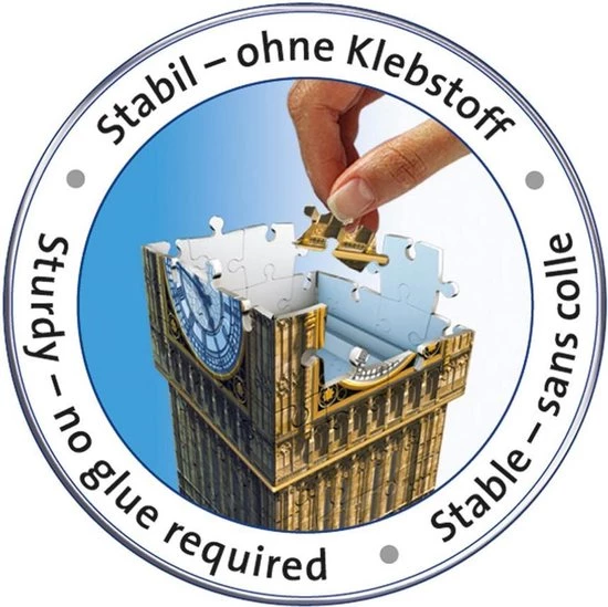 Uniek drie dimensionaal puzzelplezier, dat zijn de 3D gebouwen puzzels van Ravensburger! Puzzel prachtige 3D bouwwerken in elkaar en geef ze een mooi plaatsje op o. a. je wandplank of op het dressoir! De stevige plastic stukjes passen precies in elkaar. Zo bouw je vanuit gebogen, platte en vouwbare stukjes een uniek model van de Big Ben, zonder lijm te gebruiken!