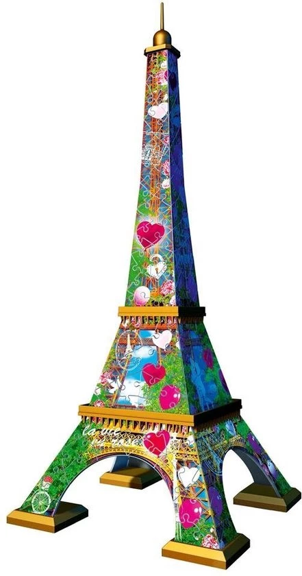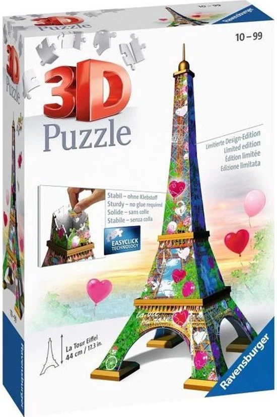 Uniek drie dimensionaal puzzelplezier, dat zijn de 3D gebouwen puzzels van Ravensburger! puzzel prachtige 3D bouwwerken in elkaar en geef ze een mooi plaatsje op o. a. je wandplank of op het dressoir! De stevige plastic stukjes passen precies in elkaar. Zo bouw je vanuit gebogen, platte en vouwbare stukjes een uniek model van de Eiffeltoren met love design, zonder lijm te gebruiken!