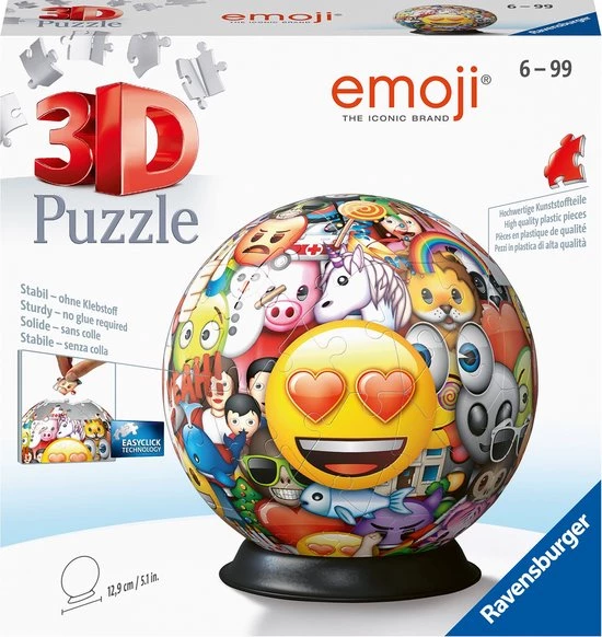 Uniek drie dimensionaal puzzelplezier, dat zijn de 3D puzzels van Ravensburger! De stevige plastic stukjes passen precies in elkaar. Zo bouw je vanuit 72 gebogen stukjes de unieke afbeelding van Emoji, zonder lijm te gebruiken!