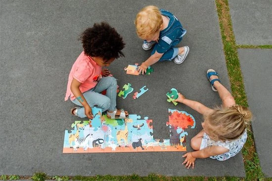 Scratch Vloerpuzzel Safari. Deze grote vloerpuzzel met als thema safari bestaat uit 36 puzzelstukken, afmeting 100 cm op 33 cm. Op de puzzel zien we een aantal typische dieren die we op safari door de Afrikaanse savannes ook kunnen ontmoeten. We herkennen o.a. giraffen, een zebra, olifanten, flamingo’s, apen, een neushoorn, leeuw, ooievaar en een schildpad.Deze kwalitatieve puzzel vol exotische dieren zal dan ook in de smaak vallen bij kindjes vanaf 3 jaar.