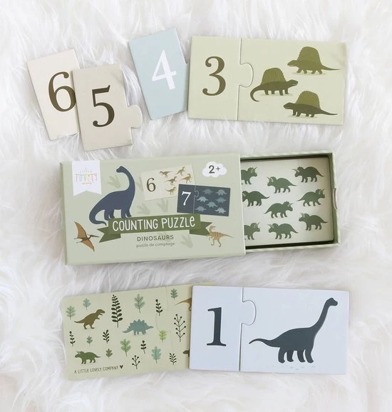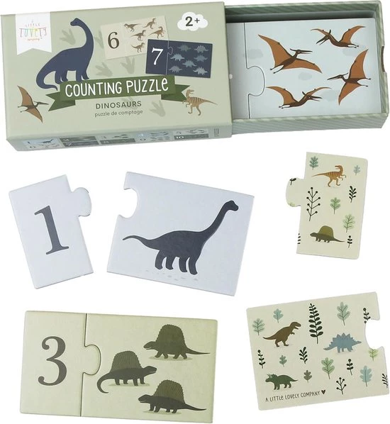 Leer tellen van ??n tot tien met deze leuke dinosaurus puzzelset. De set bestaat uit 10 losse puzzels. Op het ene puzzelstukje staat het cijfer en op het andere het aantal dinosaurussen dat bij het cijfer hoort.