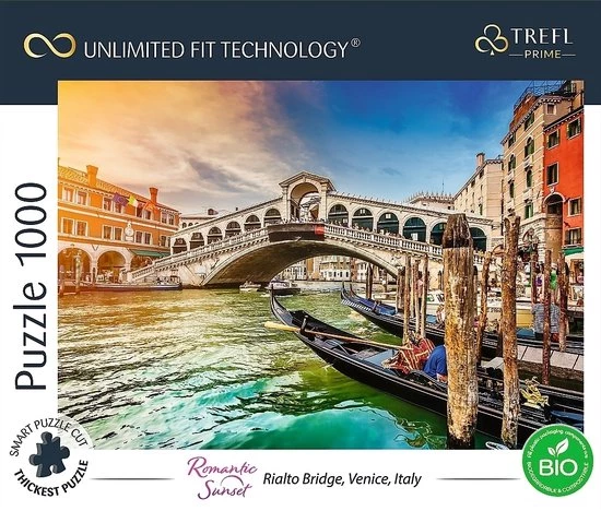 De Trefl Prime Rialto Bridge Veneti? puzzel – 1000 stukjes is gemaakt voor echte puzzelliefhebbers. De afmetingen van de puzzel zijn: 683 x 480 mm. De puzzels zijn gemaakt van hoogwaardige materialen met behulp van het dikste karton, unieke vormen en een speciale snijmethode. Zo kunnen we een individuele collage maken en de hele puzzel gemakkelijk overbrengen. Bovendien zijn de afzonderlijke elementen van de producten gemaakt van ecologische materialen. De stickers op de doos zijn gemaakt van biologisch afbreekbare folie. De producten zijn niet in krimpfolie verpakt.