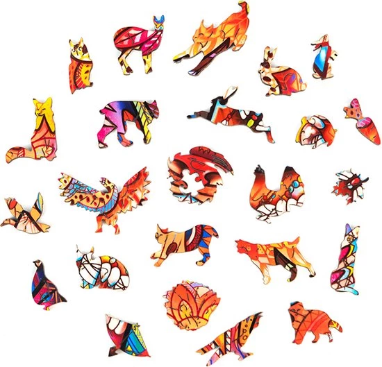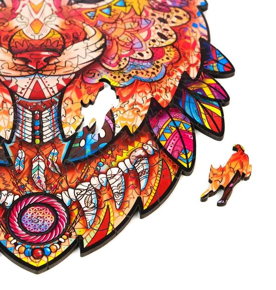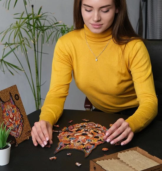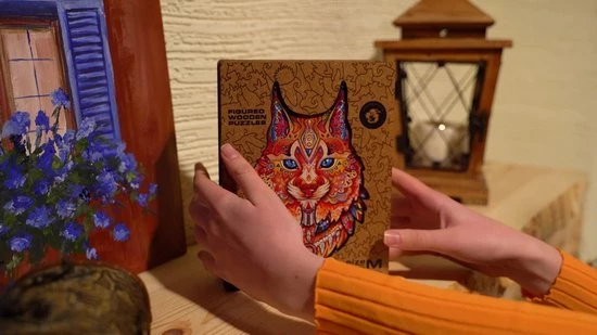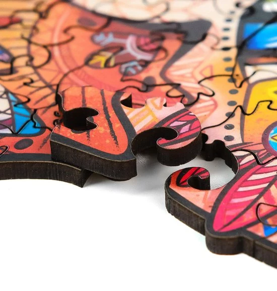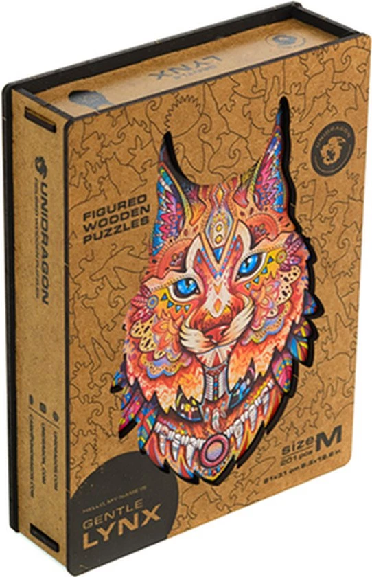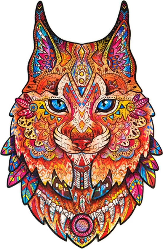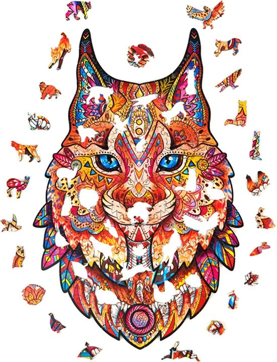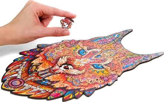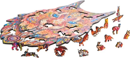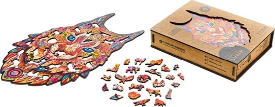 Met deze UNIDRAGON houten puzzel heb je niet een gewone legpuzzel maar ook nog eens een unieke artwork. De puzzel bevat unieke stukjes in de vorm van verschillende dieren, figuren, symbolen en nog veel meer, die samen een kleurrijke lynx vormen. Elk stukje vertelt een verhaal. Het is dus een echte uitdaging om het juiste stukje te vinden. Deze prachtige puzzel is een spel dat je IQ verhoogt. Superleuk om samen met het hele gezin in elkaar te zetten.